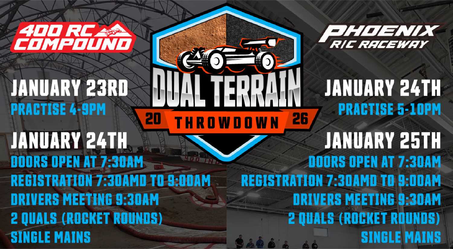 Get ready for an action-packed off-road trophy race weekend as 400 RC Compound and Phoenix RC Raceway team up to bring you a true test of drivers and machines. Dirt on one day, carpet the next. Same chassis. Different battlefield.