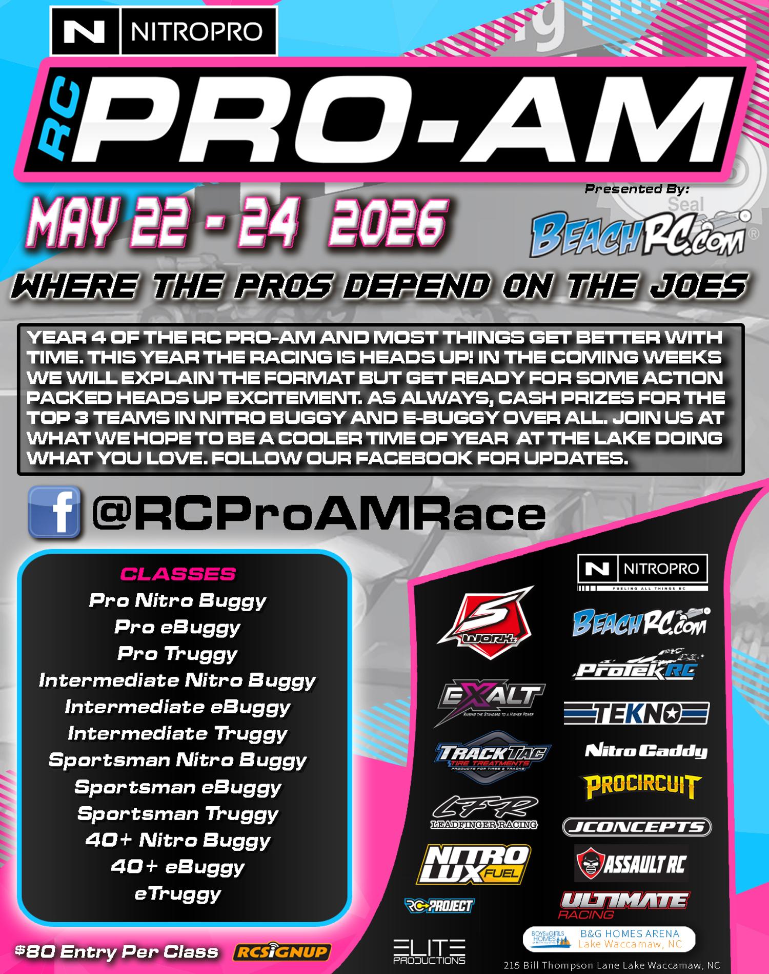 The NitroPro Racing RC Pro-Am presented by BumpMaster will be the Memorial Day Weekend this year as we try and escape the heat and make sure the kiddos are out of school to enjoy. We plan to have everything we have had in the past like our Catered Draft Party, Awesome track built by Brian Burnette, The best coverage in RC by Elite RC Productions, A Cash Purse for the pros who participate in the Pro-Am and this year And for the FIRST TIME WE ARE INTRODUCING HEADS UP RACING IN ALL CLASSES. The format will be released on Facebook on the RC Pro-Am Page.