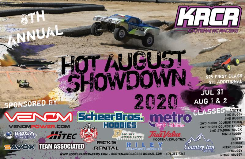 The Hot August Showdown 2020 is a weekend long race held at the Kootenai RC Racers’ new home track: Cabinet Mountain RC Raceway in Libby, MT! This huge dirt track, designed by Chad Dodd, is ready for its HAS debut. Also debuting at HAS 2020 are three new classes: eTruggy, Nitro Truggy, and Mini-Truggy! If you are looking for some great RC racing in northwest Montana, the Hot August Showdown – in its eighth year – is the place to be! Event WiFi provided by Libby’s Metro by T-Mobile. Food vendors will be on site. Practice: July 31st – 0800 drivers’ meeting / 0830 start Qualifying: August 1st – 0800 drivers’ meeting / 0830 start Finals: August 2nd – 0800 drivers’ meeting / 0830 start **MyLaps Transponders Required - NO loaner or rental transponders available** Entry Fees: KRCR Club Member: $10.00 each class Non Member: $25.00 first class, $15.00 each additional class Classes: 1/10th Scale: • 2WD Buggy • 4WD Buggy • 2WD Short Course Truck • 4WD Short Course Truck • 2WD Stadium Truck • Mini-Truggy 1/8th Scale: • eBuggy • Nitro Buggy • eTruggy • Nitro Truggy Classes may be combined, similar to the HAS 2019 format, if entries are low in any class. **2S LiPo only for 1/10th-scale classes** **4S LiPo only for 1/8th-scale classes** **MyLaps Transponders Required - NO loaner or rental transponders available** Our excellent 2020 sponsors include: Scheer Bros. Hobbies Venom Power Boca Bearing Company Hitec / Multiplex USA Savox USA Team Associated Big Sky Lumber Supply Country Inn Motel Libby Volunteer Fire Department Metro by T-Mobile Rick's Rental Riley Excavating and Concrete Kootenai Drug True Value, Troy, MT