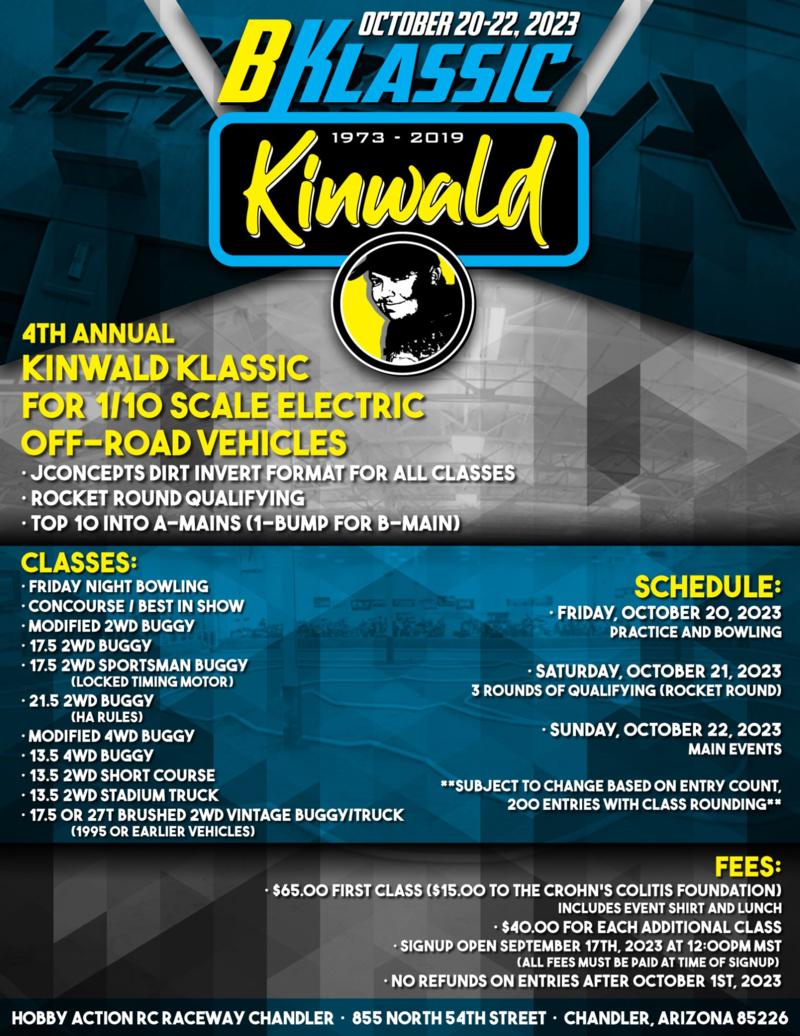1/10 Scale Electric off road event to remember Brian Kinwald. Three rounds of qualifying (rocket round) determines qualifying order. Top 10 in each class go into the Triple A-Mains, with singe bump for B-Main. No bump ups from lower mains. Triple A-Mains will use the JConcepts Dirt Invert Format. See flier for Vintage class rules. No refunds after October 1st. To be placed on the wait list please e-mail larry@hobbyaction.com with your name and classes you wish to enter. $15.00 for each first entry will be donated to the Chron's Cholits Foundation of Arizona in Brian's name.