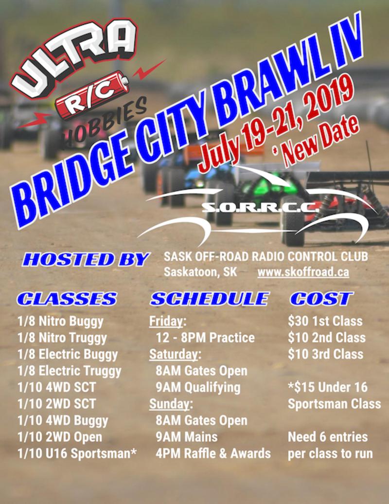 The 'Ultra R/C Hobbies' Bridge City Brawl is the largest event of the year for the Saskatoon Off-Road Radio Control Club. Visit www.skoffroad.ca for more information about the club, track and race program. Note all electric classes will have triple A mains.